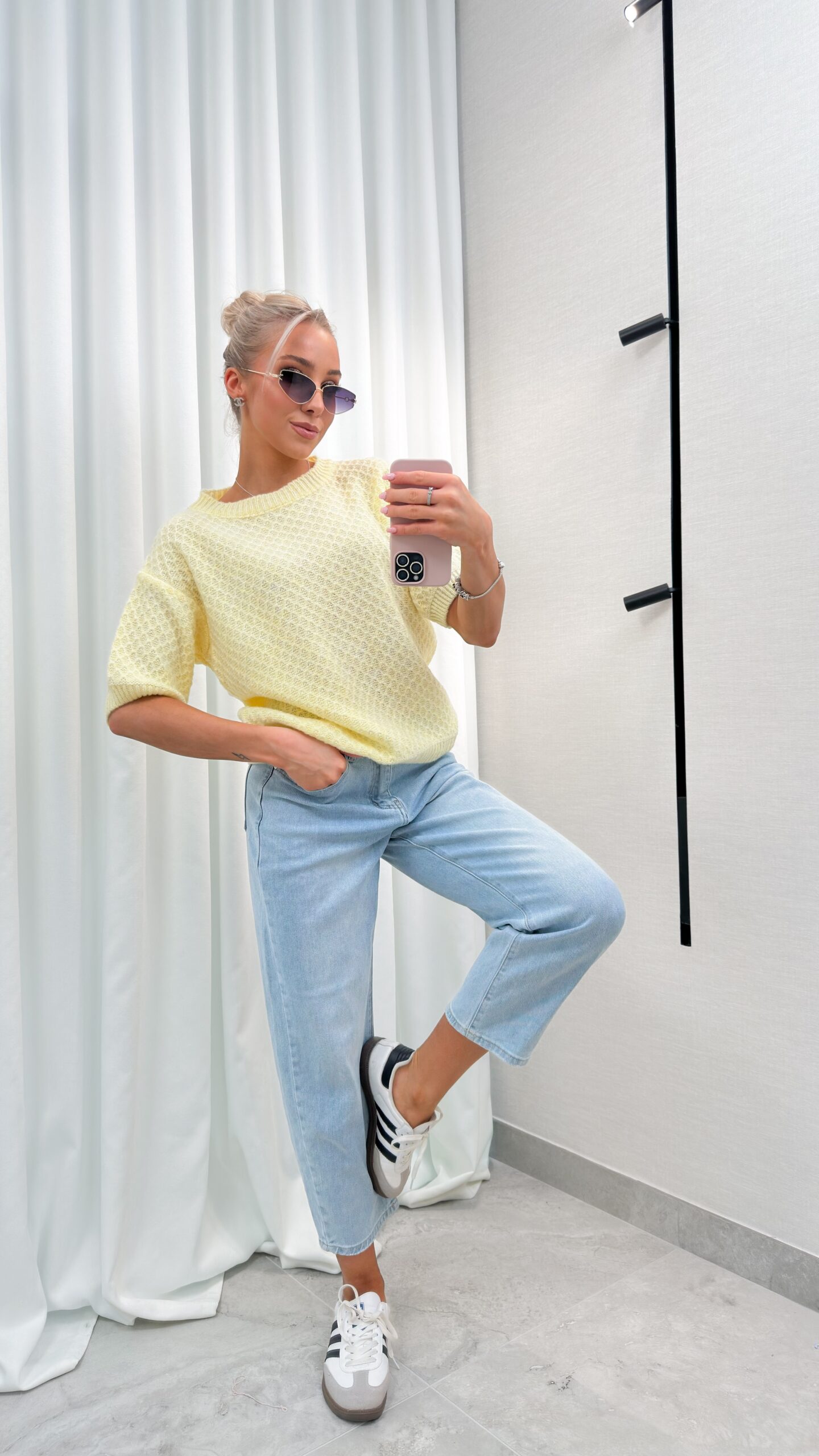 Sweterek jest niezwykle uniwersalny. Stwórz świeży, codzienny look z klasycznymi jeansami (jak na zdjęciu) lub połącz go ze zwiewną spódnicą midi, by uzyskać bardziej romantyczny efekt.