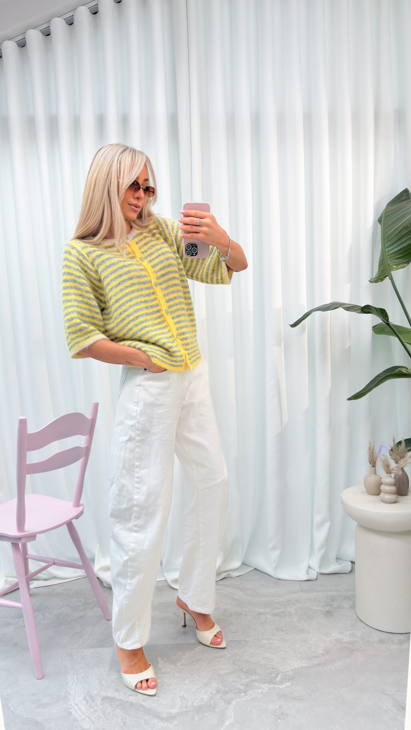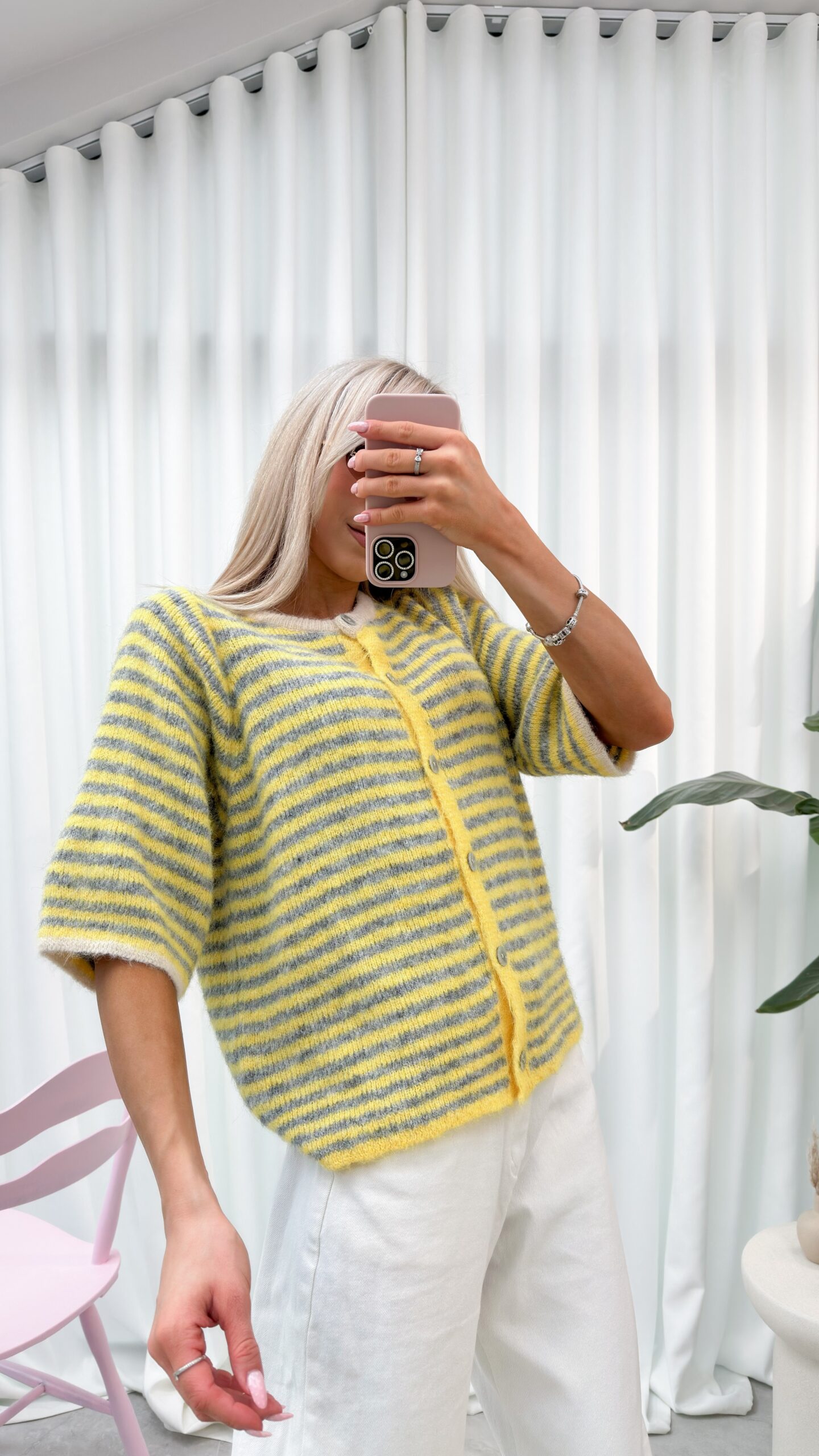 • Klasyczne paski: Ponadczasowy wzór w poziome paski nadaje całości charakteru i sprawia, że sweterek pasuje do wielu zestawień.